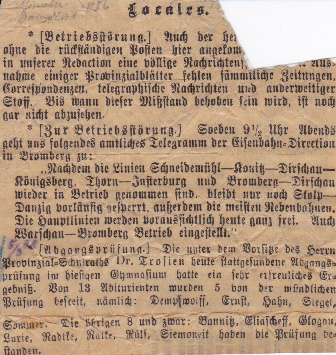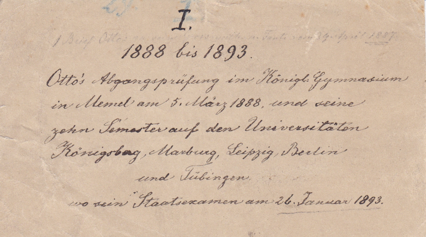 1888-03-05 Abitur (general qualification for university entrance in Germany) at Luisen-Gymnasium in Memel, Prussia