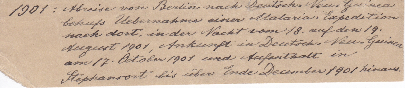 1901--1903 in German New Guinea (Stephansort) à la suite for the purpose of malaria research on behalf of Robert Koch, then in Berlin at the "Preußisches Institut für Infektionskrankheiten"